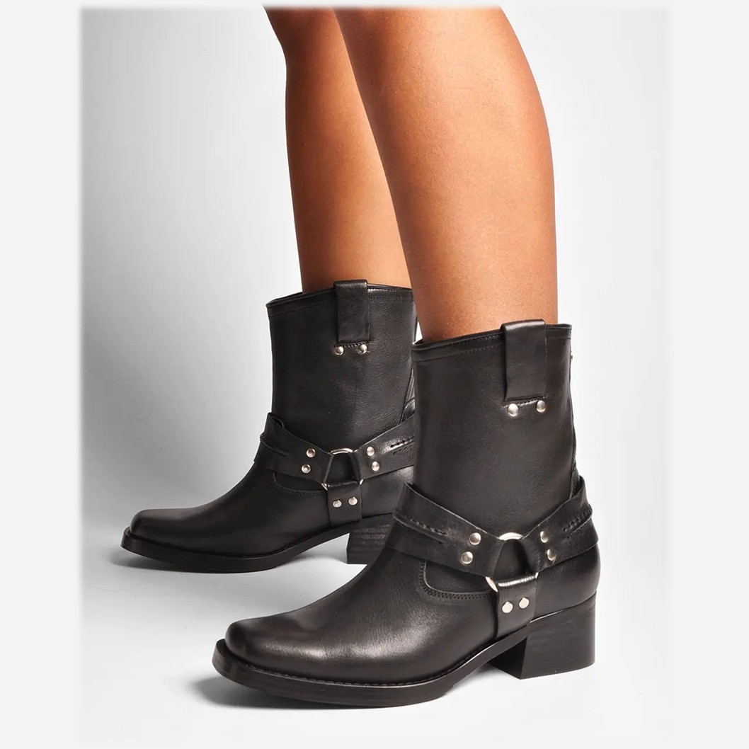 Conforto, qualidade e um design marcante definem esta bota em pele da Ruika. De inspiração biker, destaca-se pela argola metálica lateral e pelas aplicações em tachas, que conferem personalidade e caráter a cada passo. O salto médio e robusto garante estabilidade e elegância, tornando-a perfeita tanto para o dia a dia como para ocasiões mais arrojadas.