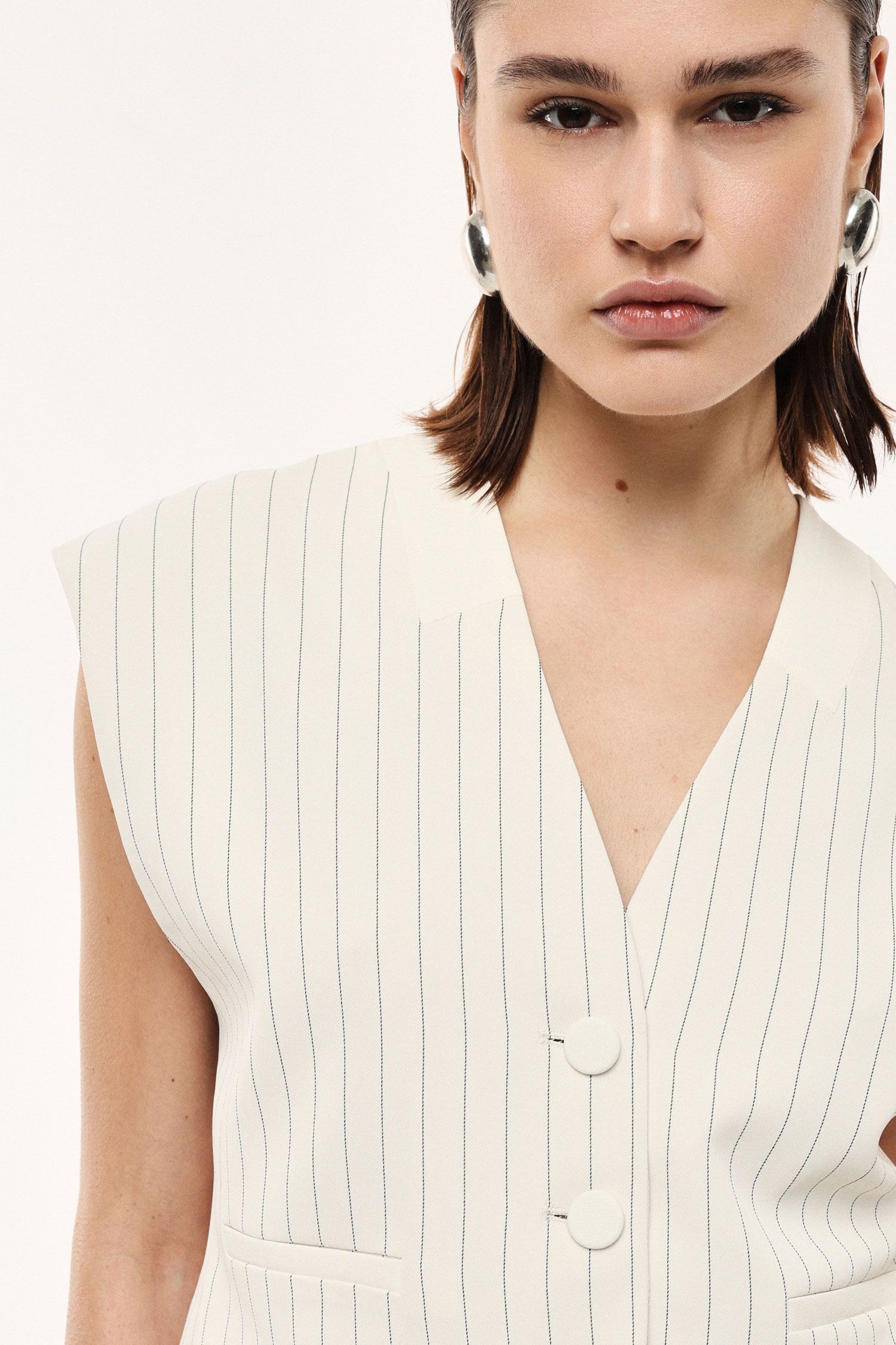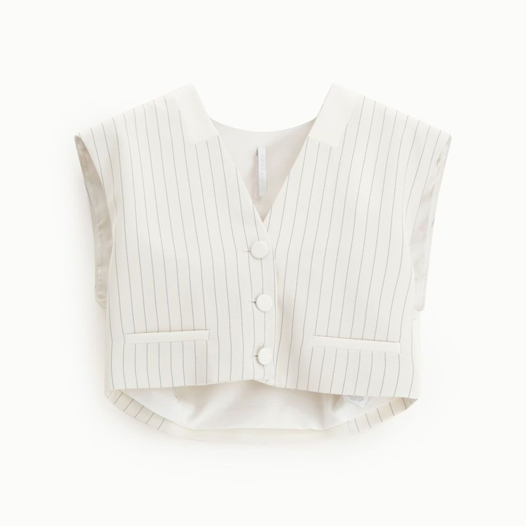 Este colete moderno e curto apresenta um delicado padrão de listras, fechamento com botões forrados e dois bolsos frontais. Perfeito para quem busca versatilidade e precisão no guarda-roupa do dia a dia, ele adiciona um toque estruturado e contemporâneo a looks sofisticados e permite expressar o estilo individual.