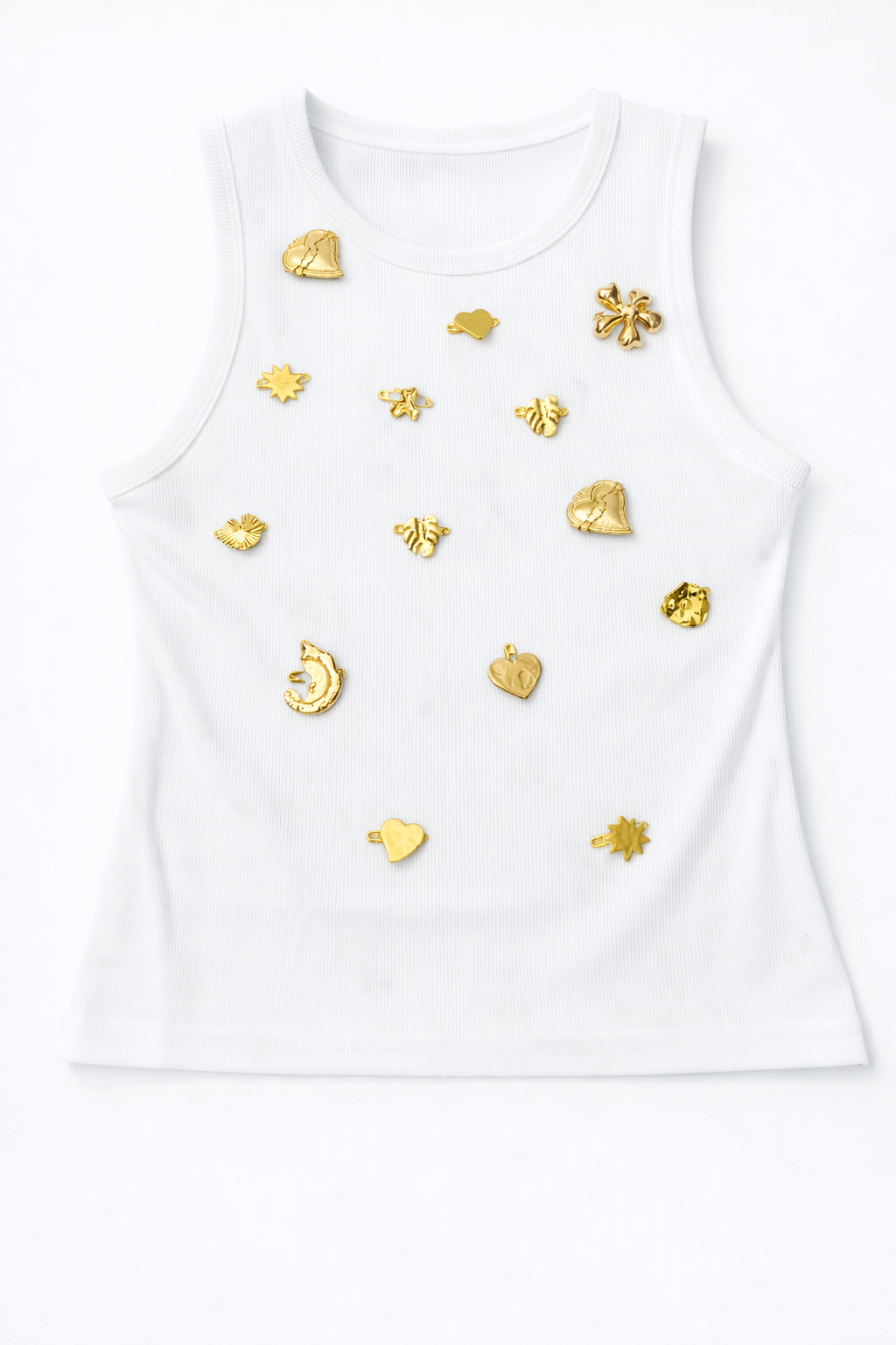 T-shirt branca de corte simples com aplicações metálicas distribuídas. Básica com detalhe marcante que transforma o look.
