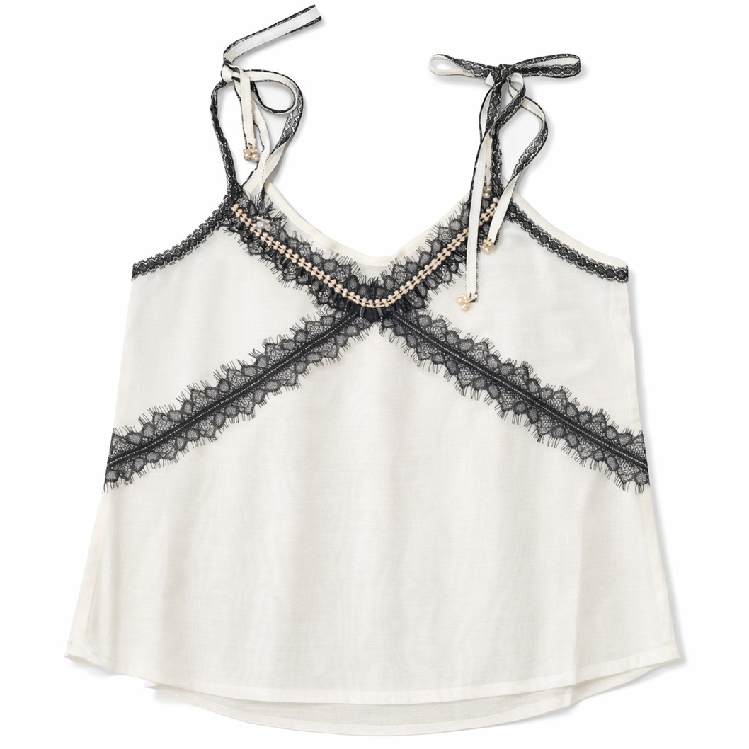 Top leve com alças finas ajustáveis e aplicação de renda contrastante. Modelagem solta que traz delicadeza ao visual. Bonito, mas pouco estruturado, não oferece suporte e pode exigir cuidado extra na escolha do sutiã